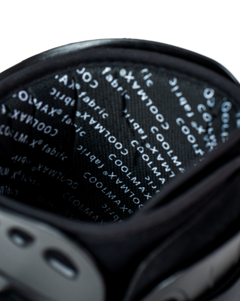 Czynność zakładania najlepiej wykonać w pozycji siedzącej. Noga powinna być lekko zgięta w stawie kolanowym. 1. Rozpiąć taśmy dociagające. 2. Wyciągnąć przedni element ortezy oraz odpiąć i wyciągnąć wewnętrzną wyściółkę COOLMAX®. 3. Wewnętrzną wyściółkę COOLMAX® założyć na nogę, którą następnie należy zapiąć i włożyć do buta. 4. Założyć przedni element ortezy. 5. Zapiąć taśmy dociągające. 6. Przy pomocy pompek i zaworów (znajdujących się po bocznych stronach buta) należy wyregulować stabilizację nogi w bucie. Aby napompować pojedynczą komorę należy naciskać pompkę w równomiernym tempie aż do momentu osiągnięcia odpowiedniego ciśnienia. Czynność tę powtórzyć analogicznie w przypadku drugiej komory. 7. Aby wypuścić powietrze z komory należy nacisnąć i przytrzymać wewnętrzny przycisk zaworu. Czynność powtórzyć analogicznie w przypadku drugiej komory. 8. Aby zapewnić najlepszą możliwą stabilność, rzepy należy regulować w pozycji stojącej.