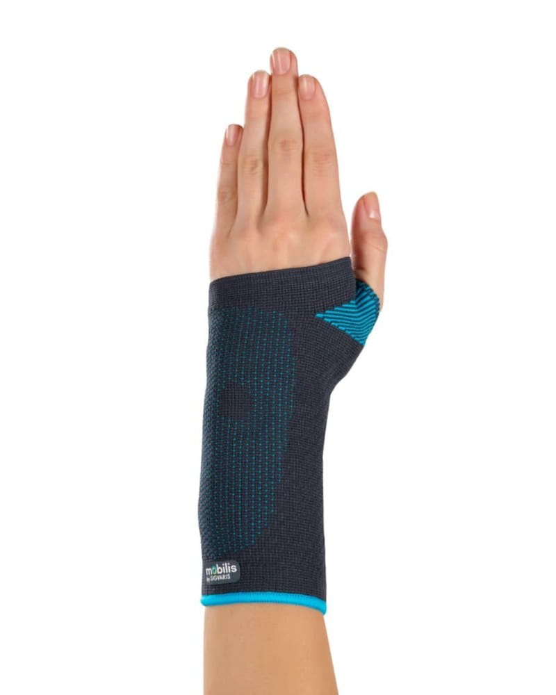 Stabilizator nadgarstka Mobilis ManuActive to bardzo dobrze przylegająca, anatomicznie dopasowana dzianina, która odciąża stawy w przypadku bólów powiązanych ze schorzeniami chorobowymi typu artroza, artretyzm czy zapalenie ścięgien. Jej komfortowe użytkowanie nie krępuje ruchów, zatem możemy sobie pozwolić podczas jej użytkowania na wszelkie aktywności, które nie destabilizują naszego życia. Dzianina jest uformowana z oddychającej tkaniny, utkanej kompresyjnie, a zastosowane rozwiązanie w postaci szyny na dłoń i pelocie zapewnia doskonałą stabilizację dłoni.